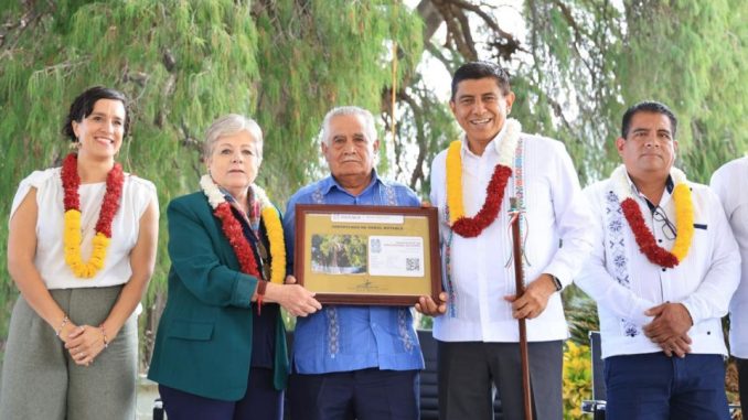 La secretaria de Medio Ambiente y Recursos Naturales (Semarnat) del Gobierno de México, Alicia Bárcena Ibarra, y el gobernador Salomón Jara Cruz entregaron ocho certificados de Árboles Notables e Históricos a autoridades municipales.
