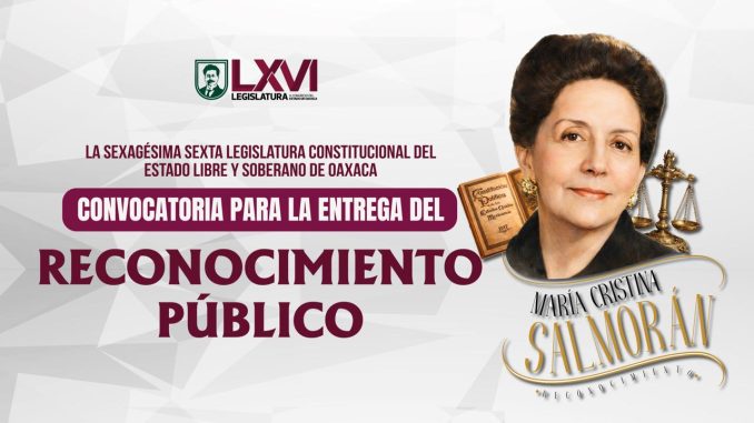 La LXVI Legislatura del Congreso de Oaxaca emitió la convocatoria para participar en el proceso para la entrega del Reconocimiento Público “María Cristina Salmorán” 2026, en el marco de la conmemoración del Día Internacional de la Mujer.