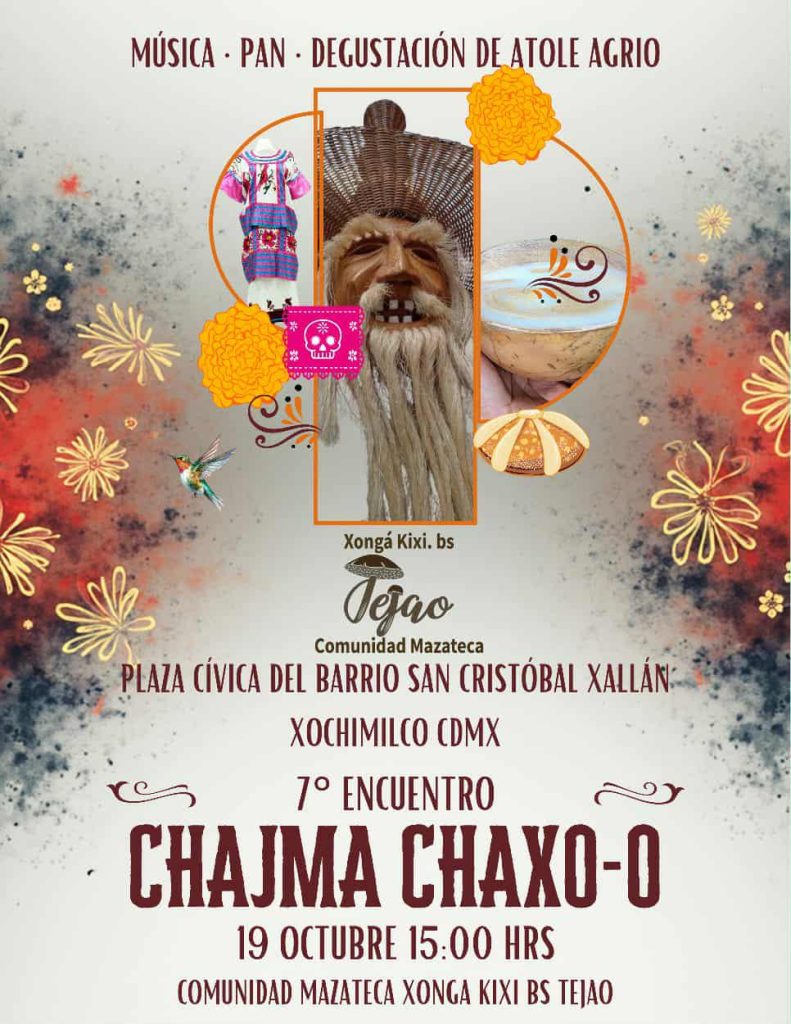 Xochimilco, Ciudad de México.- En la plaza cívica del barrio de San Cristóbal, de la alcaldía Xochimilco de la Ciudad de México, la comunidad mazateca se hará presente con el 7º Encuentro de Huehuentones -Chajma Chaxo’o-, a celebrarse el próximo domingo 19 de octubre.