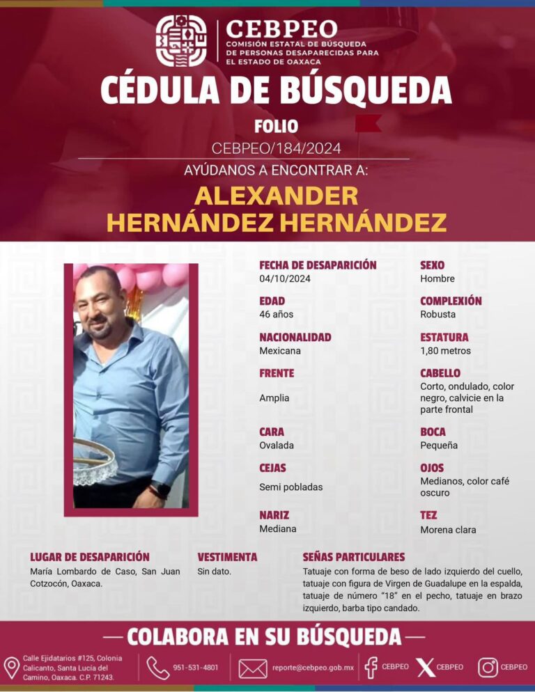 El titular de la Fiscalía General del Estado de Oaxaca, Bernardo Rodríguez Alamilla, informó el hallazgo sin vida de la abogada mixe Sandra Estéfana Domínguez y su esposo Alexander Hernández Hernández, de 38 y 46 años de edad respectivamente, desaparecidos el 4 de octubre de 2024.