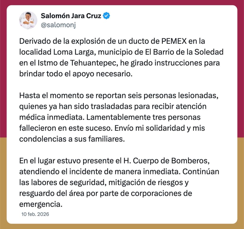 Una explosión registrada en un ducto de Pemex, en el municipio de El Barrio de la Soledad, en la región del Istmo de Tehuantepec, dejó al menos tres personas sin vida y seis más lesionadas.