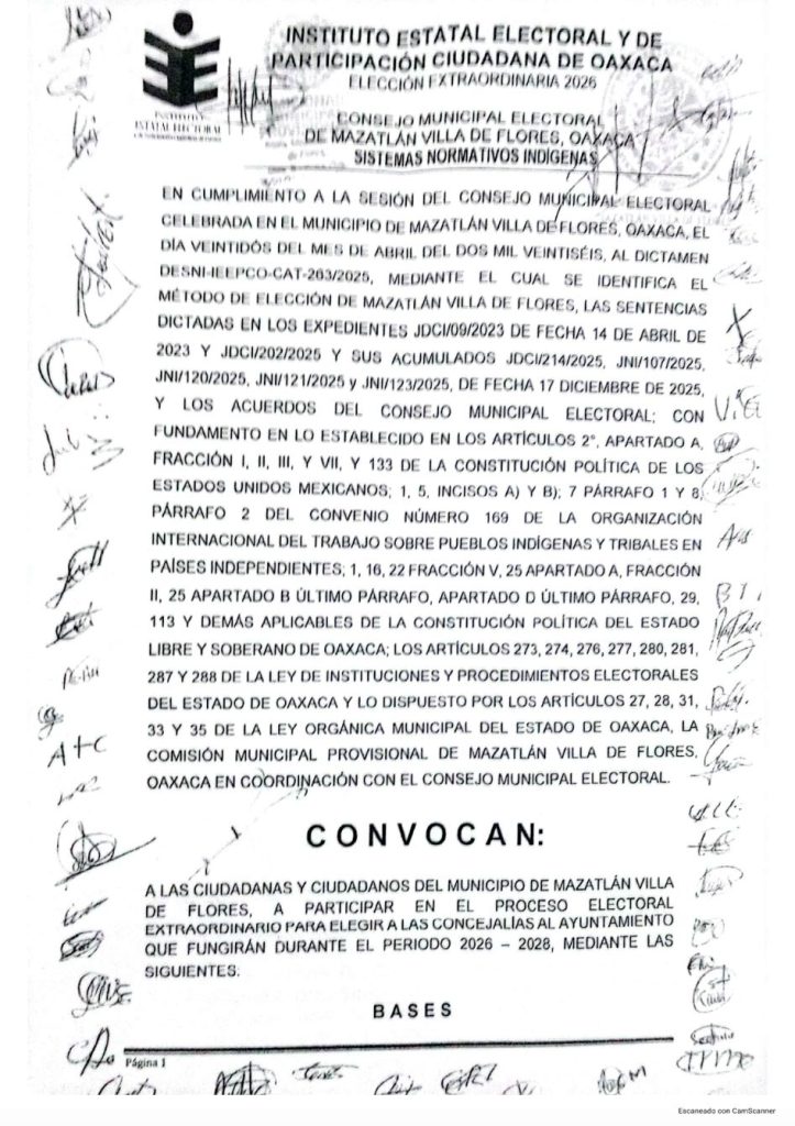 La Comisión Municipal Provisional de Mazatlán Villa de Flores y el Consejo Municipal Electoral emitieron la convocatoria para celebrar, el próximo 23 de mayo, la elección extraordinaria de autoridades municipales que fungirán durante el periodo 2026 – 2028.