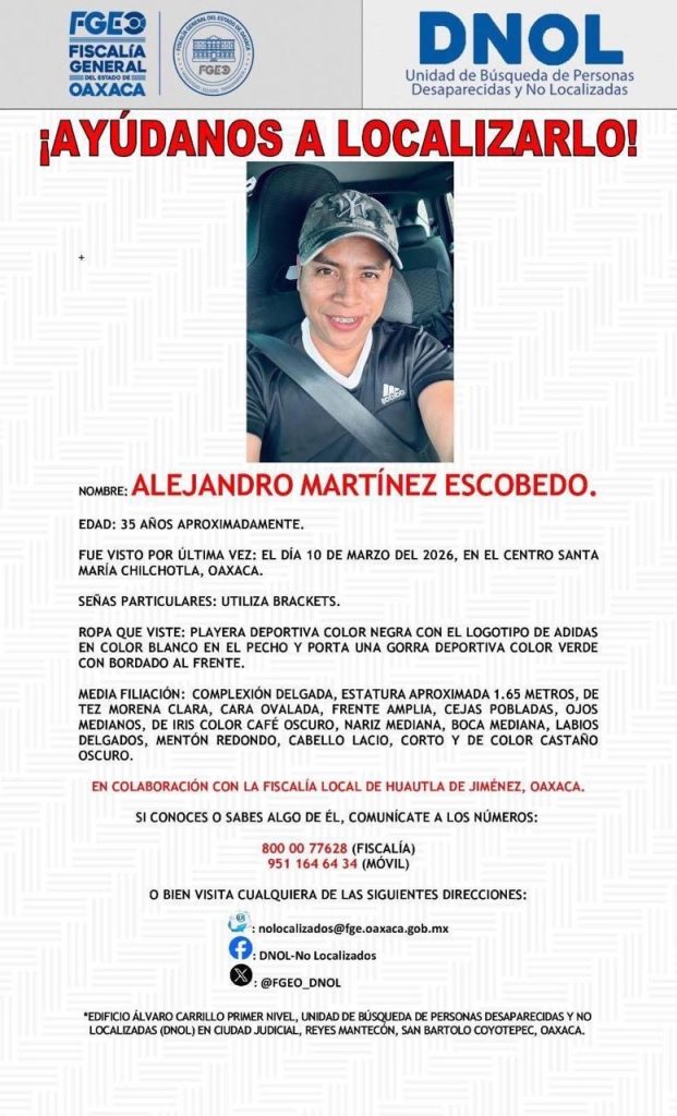 Puso a disposición de la ciudadanía el número 800 00 77628 (Fiscalía) y 951 164 64 34 (Móvil) para reportar cualquier dato que lleve a Alejandro Martínez Escobedo.