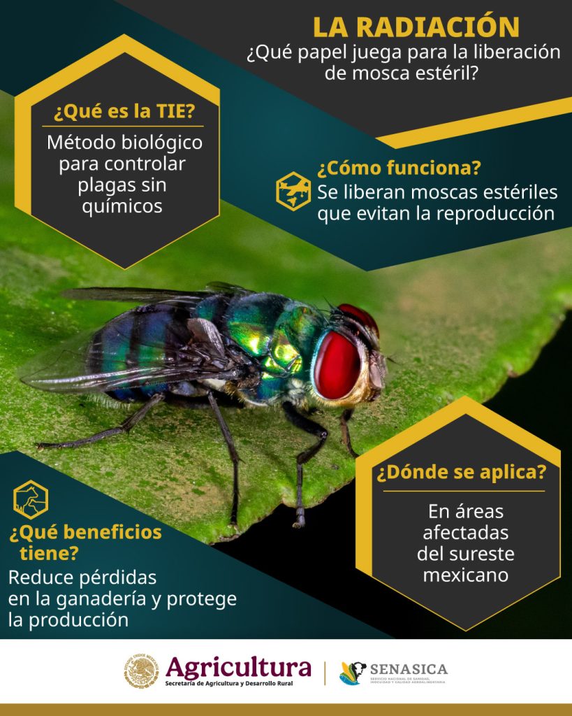 Desde el año pasado, el Gobierno de México a través del Servicio Nacional de Sanidad, Inocuidad y Calidad Agroalimentaria (Senasica) aplica la Técnica del Insecto Estéril (TIE) en zonas clave del país para controlar la plaga del gusano barrenador.
